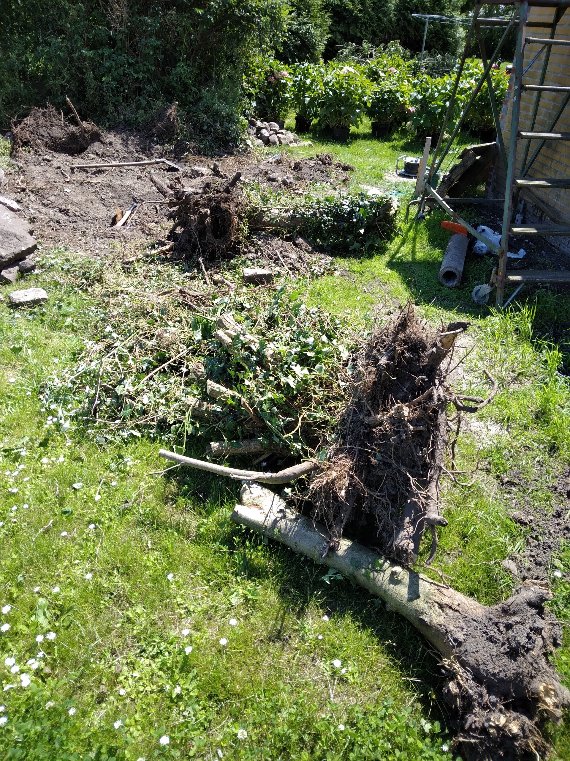 Dus dat werd woensdagochtend eerst kettingzaag slijpen en snoeien. Vervolgens rondom de bomen graven met een schep, wortels met een bijl doorhakken en de boomstronken verwijderen. Echter bij de eerste schep in de grond stuitte ik meteen op beton. Zo ook de 2e, 3e enz. Wat bleek nu, precies op de plek van de bomen lag nog een oude betonnen vloer/oprit. Dus in plaats van met de schep werken heb ik alles met hamer/beitel en breekijzer moeten verwijderen om zo ruimte bij de wortels te krijgen. Maar ook nu geld weer, de aanhouder wint. Na 5 uren was het beton verwijderd en had ik de bomen gerooid. Nu kon ik eindelijk beginnen met het uitzetten van waar de hortensia's geplaats konden worden.