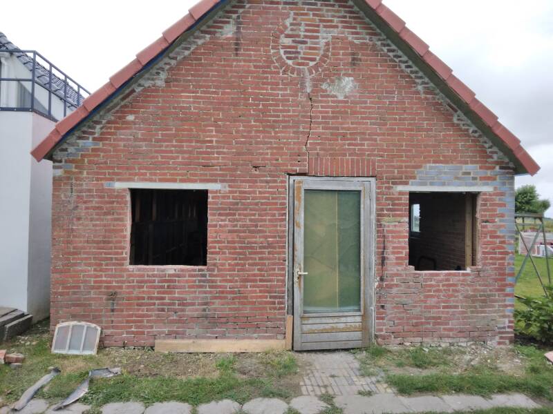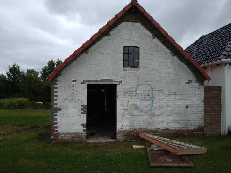 Na eerst wat andere werkzaamheden te hebben uitgevoerd zijn we afgelopen week dan eindelijk toegekomen aan het (dicht) metselen van ramen en deuren van het vakantiehuisje. Allereerst hebben we 8 stalramen verwijderd, daarna de twee raamkozijnen aan de tuinkant en tot slot de 'oude' voordeur. Aangezien dit boven verwachting snel ging hadden we mooi wat tijd over om alles weer dicht te metselen.